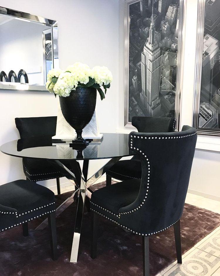 BASE DE COMEDOR EN ACERO INOXIDABLE Y TABLERO EN VIDRIO LAMINADO NEGRO Y 4 SILLAS EN MADERA TORNILLO CON TAPIZ VELVET